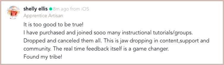 “It is too good to be true! I have purchased and joined sooo many instructional tutorials/groups. Dropped and canceled them all. This is jaw dropping in content, support, and community. The real-time feedback itself is a game changer. Found my tribe!”